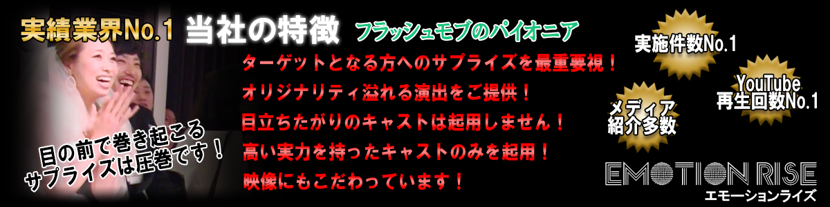 フラッシュモブ実施件数は業界No.1!フラッシュモブを企画代行する会社は多数ありますが、 当社は驚きと感動をモットーにターゲットとなる方へのサプライズを最重要視し、クオリティにこだわっています。 おかげ様で当社のフラッシュモブが好きというお客様からのお問い合わせをたくさんいただき、実施件数も業界No.1を誇ることが出来ています! また、YouTubeでの動画再生回数も皆様のご支持によりたくさんの方々にご覧いただいております。